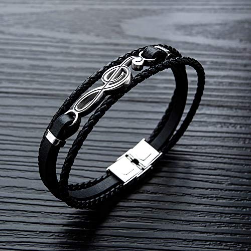 XHao Bracciale Uomo Braccialetto Pelle Nota Decorazione e Fibbia di Sicurezza in Acciaio Inossidabile - Nero
