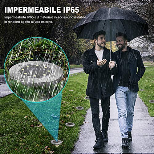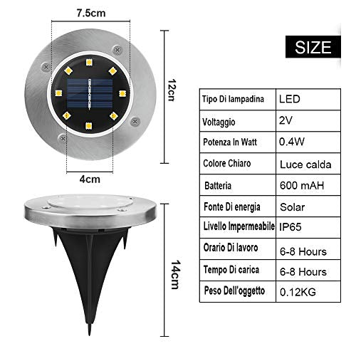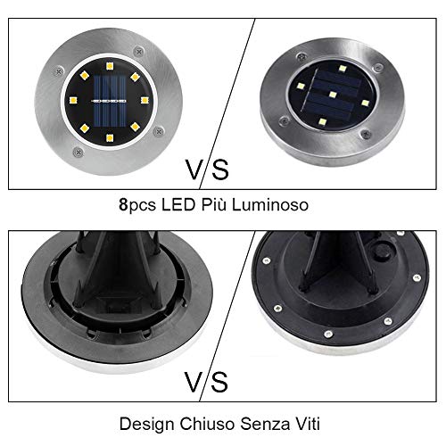 - Funzionamento Automatico Queste lampade solari da giardino hanno il sensore di luminosità integrato (crepuscolare). Le Luci si accendono automaticamente durante la sera e si spengono automaticamente durante le prime luci del giorno. Inoltre, sul retro è presente un pulsante di accensione/spegnimento. Queste Luci solari giardino essendo costituite da ben 8 led emettono più luce (100lm) rispetto a quelle a 4 led, consentendo una migliore visibilità.