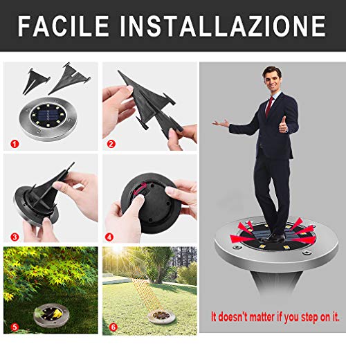 - Facile Installazione Le luci solari non necessitano del collegamento alla rete elettrica e di attrezzi per il montaggio. Il suo design conico permette l'inserimento nel terreno in modo semplice e veloce. Le lampade solari vengono alimentate da batterie che vengono continuamente ricaricate da un piccolo pannello fotovoltaico che sfrutta l’energia solare. Nota: si prega di accendere l'interruttore quando si prendono le luci del giardino per assorbire la luce solare.