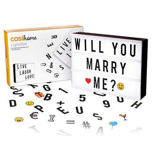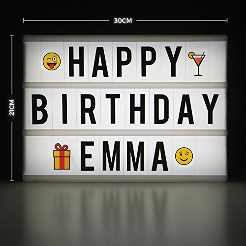 - SCATOLA LUMINOSA: Cinematic light box in formato A4 con 100 lettere, emoji e simboli e 3 righe per il testo. Funziona con il cavo USB di lunga durata per la ricarica o può essere azionato da batterie AA. Inoltre, dispone di brillanti luci a LED bianche a risparmio energetico per un'illuminazione super uniforme.