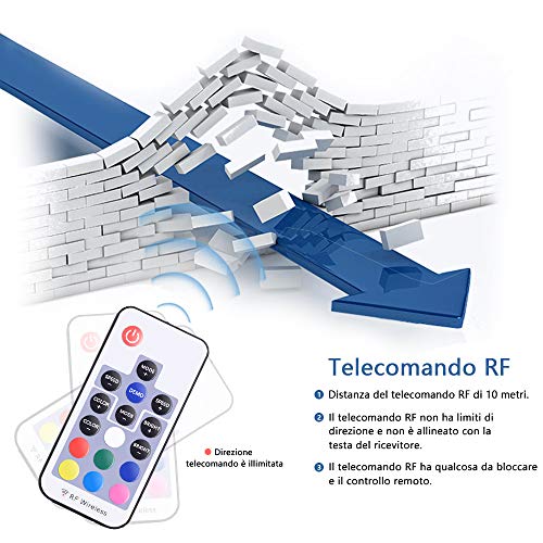 - 【Telecomando FR】 Più potente del telecomando a infrarossi, il telecomando FR può essere controllato attraverso la parete e in qualsiasi direzione (senza indicare il controller). Quindi non importa se passa qualcuno o un animale domestico, puoi comunque usare il telecomando per regolare la modalità, la luminosità. La distanza massima del telecomando è di 8 metri, 20 colori statici e 22 modalità dinamiche tra cui scegliere.