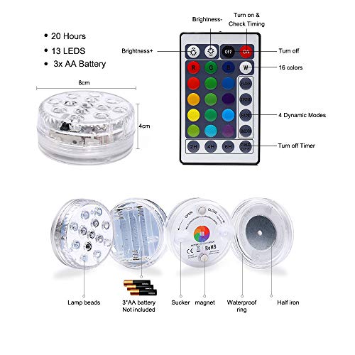 Taglia:2 pezzi [Due metodi di installazione magneti e ventose]: la nostra illuminazione da piscina luci a led subacquee sono classe di protezione IP68 l'illuminazione subacquea migliora la struttura impermeabile, il fondo che svita ha un o-ring in gomma per impedire all'acqua di entrare all'interno dotato di magneti speciali e ventose. Attaccare alla superficie del ferro con un magnete. Attaccare alla superficie liscia con una ventosa. Puoi scegliere in base ai tuoi desideri! [Max Gamma RF di 50 m / 50 piedi]: la distanza del telecomando del telecomando RF è più lunga e più stabile. Può essere facilmente controllato a 164 piedi / 50 metri in aria e 10 piedi / 2 metri sott'acqua. Non avrai paura dei blocchi del segnale, anche in piscine molto grandi e profonde attraverso i muri. Un telecomando può controllare più luci. [16 colori RGB e 13 LED forniscono una luce più luminosa e più bella]: ci sono 16 cambi di luce cromatica, 4 modalità dinamiche (Flash / Strobe / Fade / Smooth), 3 pulsanti timer (2h, 4h, 6h) sono stati aggiunti la luce dello stagno a batteria ha 13 sfere LED premium che aumentano la luminosità del 50%. È più vibrante e bello di altre lampade da stagno simili con solo 10 LED. La luce a LED è alimentata da 3 batterie AA e dura 20 ore. [Ampia gamma di usi]: la luce subacquea non può essere utilizzata solo sott'acqua, ma anche in altre occasioni, come ad esempio matrimonio, festa, scena, Halloween, discoteca, centri commerciali, guardaroba, musei, negozi, ecc. [COSA OTTIENI]: 4x Sommergibili LED Luci Piscina; Telecomando IR a 4x24 pulsanti; 8 ventose; garanzia di soddisfazione al 100% e il nostro servizio cordiale - risposta del servizio clienti via email 24 ore su 24.