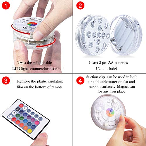 • [COSA OTTIENI]: 4x Sommergibili LED Luci Piscina; Telecomando IR a 4x24 pulsanti; 8 ventose; garanzia di soddisfazione al 100% e il nostro servizio cordiale - risposta del servizio clienti via email 24 ore su 24.