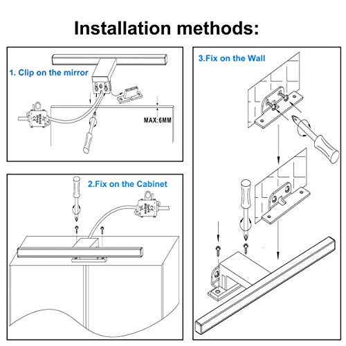 - Design pratico con 3 modi per installare questa lampada frontale a specchio: grazie al morsetto di montaggio fornito, questa lampada a specchio può essere fissata a vetrine o pareti a specchio, ma anche come lampada di attacco direttamente sullo specchio. La staffa preforata e rimovibile consente un montaggio facile e variabile su qualsiasi mobile