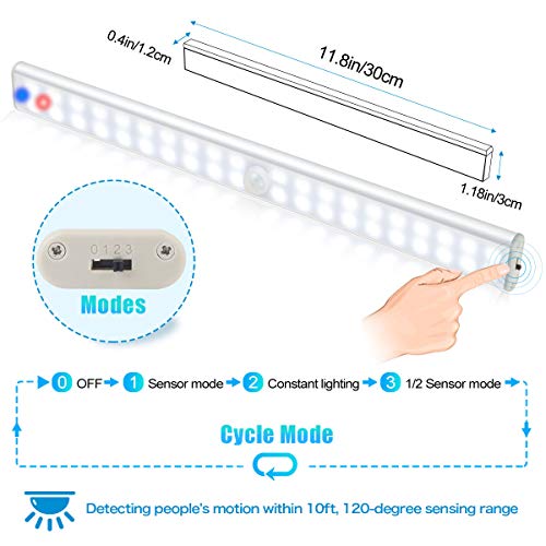 - [3 Modalità 40LED Luce Armadio] Rilevamento del movimento / illuminazione costante / rilevamento del movimento 1/2 (la luminosità è la metà del rilevamento del movimento), con la tecnologia a infrarossi, può essere rilevata dal movimento umano nell'oscurità. Autoaccensione entro 10 piedi / 120 °, autospegnimento dopo circa 15 secondi di assenza di movimento rilevato.