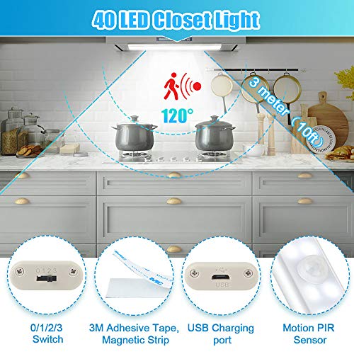 Luce Armadio 40 LED, 4 Modalità, USB Ricaricabile, Wireless Luce Notturna con Striscia Magnetica, Led Guardaroba con Sensore di Movimento per Cucina, Scala, Corridoio ed Emergenze