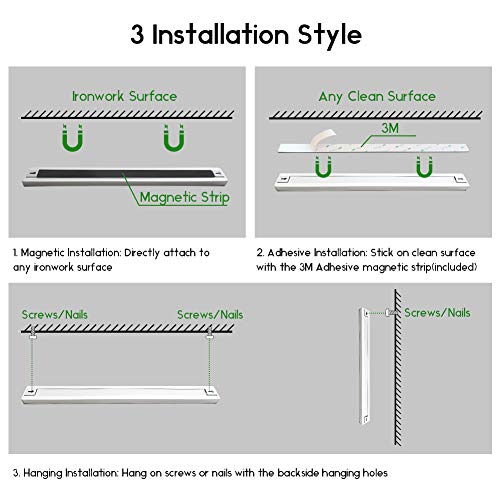 - FACILE DA INSTALLARE: 3 modi per installare questa luce dell'armadio: ①Magnet Magnete incorporato sul retro della luce; ② Con la striscia magnetica 3M inclusa, puoi attaccarla dove vuoi. ③ Puoi anche appenderlo su viti o chiodi con i fori di sospensione posteriori. Molto facile da installare e rimuovere.