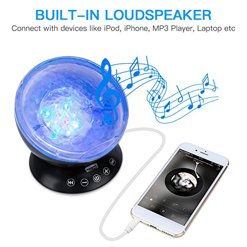 - 【Built-in lettore musicale e suoni dell'oceano】 4 tipi di suoni ambientali, come onde dell'oceano, la natura e gabbiano. Con questo luce proiettore oceano led dell'interno, i suoni si sentono così rilassante e confortevole. Può scegliere la musica quando connettivi con dispositivi come iPod, Cellulari, Lettori MP3 a seconda di quale suona musica tramite Aux-in cavo. Il silenzioso modo funziona se si vuole tacere.