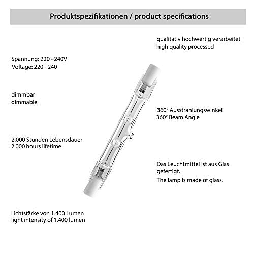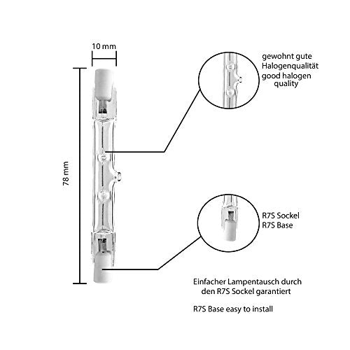 • Il nostro nuloxx – Lampadina alogena R7s è regolabile da 0 a 100% dimmerabile. Ha nessun ritardo o tempo di riscaldamento. Offre immediatamente una tassa di luce del 100% (per una durata media di 2000 ore circa). Angolo del fascio di 360 & # x366;. Realizzato in vetro trasparente. È facile da montare o lo scambio