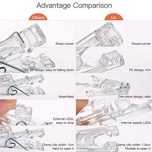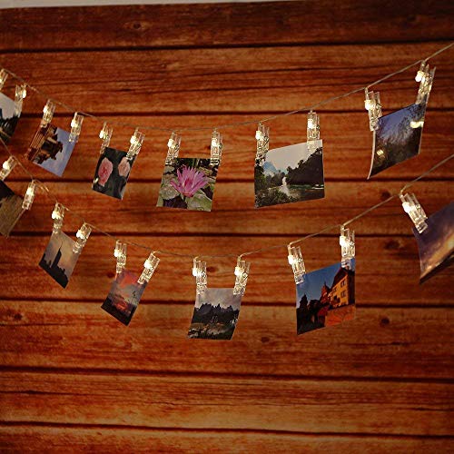 - ❤ {DESIGN CREATIVO MULTIFUNZIONALE} : questa luce di stringa clip ingegnoso non può solo risplendere il vostro posto con la sua calda e romantica luce bianca calda al buio, ma anche è possibile condividere le tue belle foto di bloccaggio sulla sua clip per salvare il tuo posto e rendendo il muro bianco colorato.