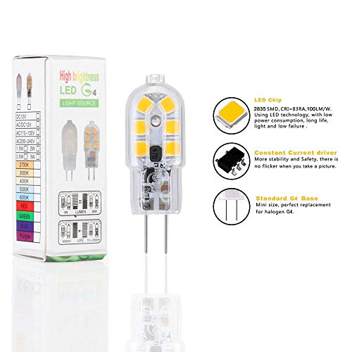 - Risparmio energetico e lunga durata: basso consumo energetico di 1,8 W, con un risparmio di elettricità fino al 93%. La lampada alogena G4 da 20W equivalente. È anche un sostituto ideale per tutte le lampade alogene G4. Ha una dissipazione del calore estremamente efficiente con una lunga durata di 30.000 ore.