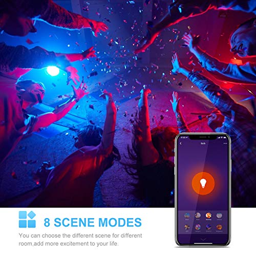 - 【Modalità Multicolore e Scene】- Lampadina intelligente ha più di 16 milioni di colori sono disponibili per il tuo riferimento. Vari colori per creare le atmosfere speciali per ogni momento. Ci sono 8 modalità di scena per soddisfare le tue esigenze di intrattenimento.(festa,cocktail party,ecc...)