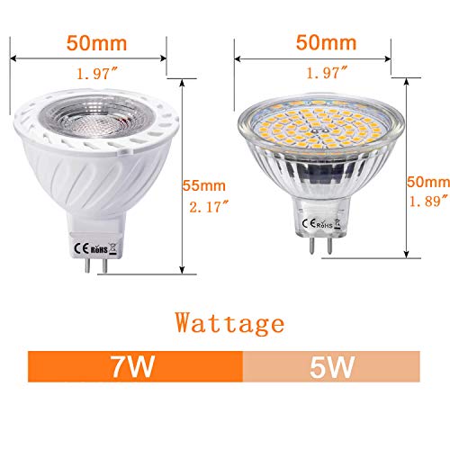 - GU 5.3/ GU5/ GX5.3 : faretto LED 7W sostituisce alogeno da 50W, 550 Lumumen, Tensione: CA / CC 12V, Non dimmerabile, Dimensioni (ØxL): 50 x 55mm