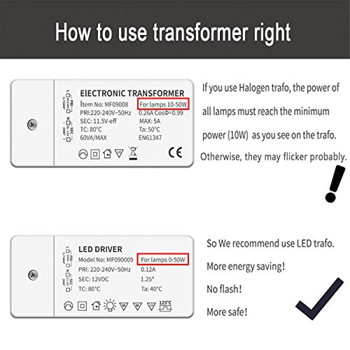 - ★ Lampada LED 12V: è meglio utilizzare un trasformatore LED. Se si desidera collegare un trasformatore alogeno, assicurarsi che l'intera potenza delle lampadine a LED dovrebbe raggiungere la potenza più bassa dei trasformatori, altrimenti potrebbero avere un stroboflash