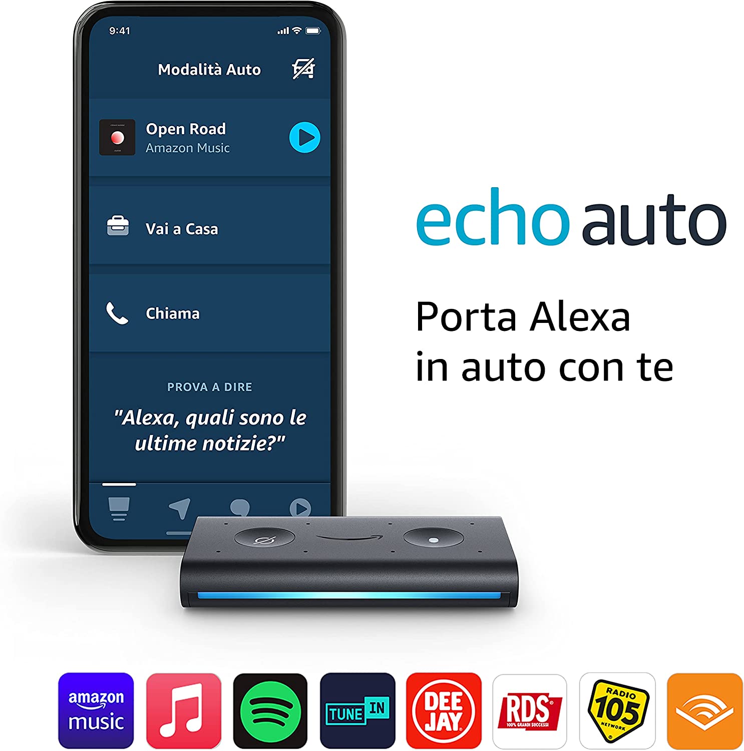 Molto più di un’autoradio - Controlla Echo Auto dall'App Alexa e ascolta contenuti in streaming da Audible, Amazon Music, Apple Music, Spotify e Deezer, oppure stazioni radio da tutto il mondo con TuneIn.
