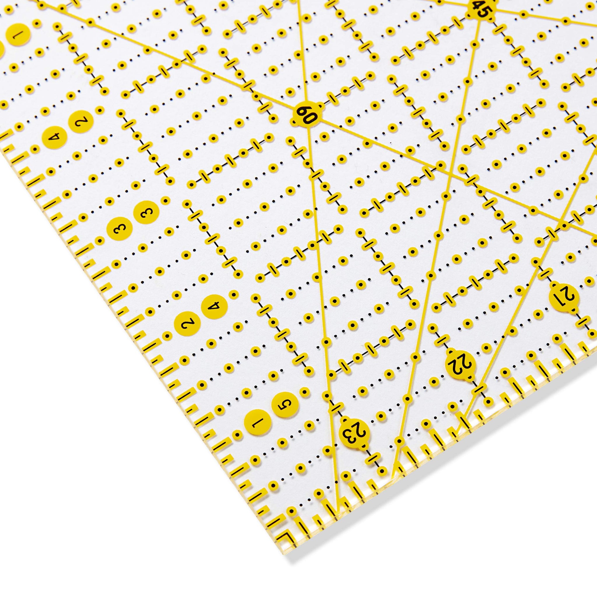 DRITZ-Omnigrid Quilter's Ruler. This ruler was made from a durable premium quality acrylic plastic and laser cut for a smooth edge that allows for easier deeper cutting of fabric layers. The patented double line effect is printed in black and yellow which allows the used to see the grid on both dark and light fabrics. Designed for left and right handed users. Used for sewing, scrapbooking, crafts, weaving and more! Has 30, 45 and 60 degree angle lines marked for easy alignment of fabric. This Ruler Measures 6x24in. Made in USA.