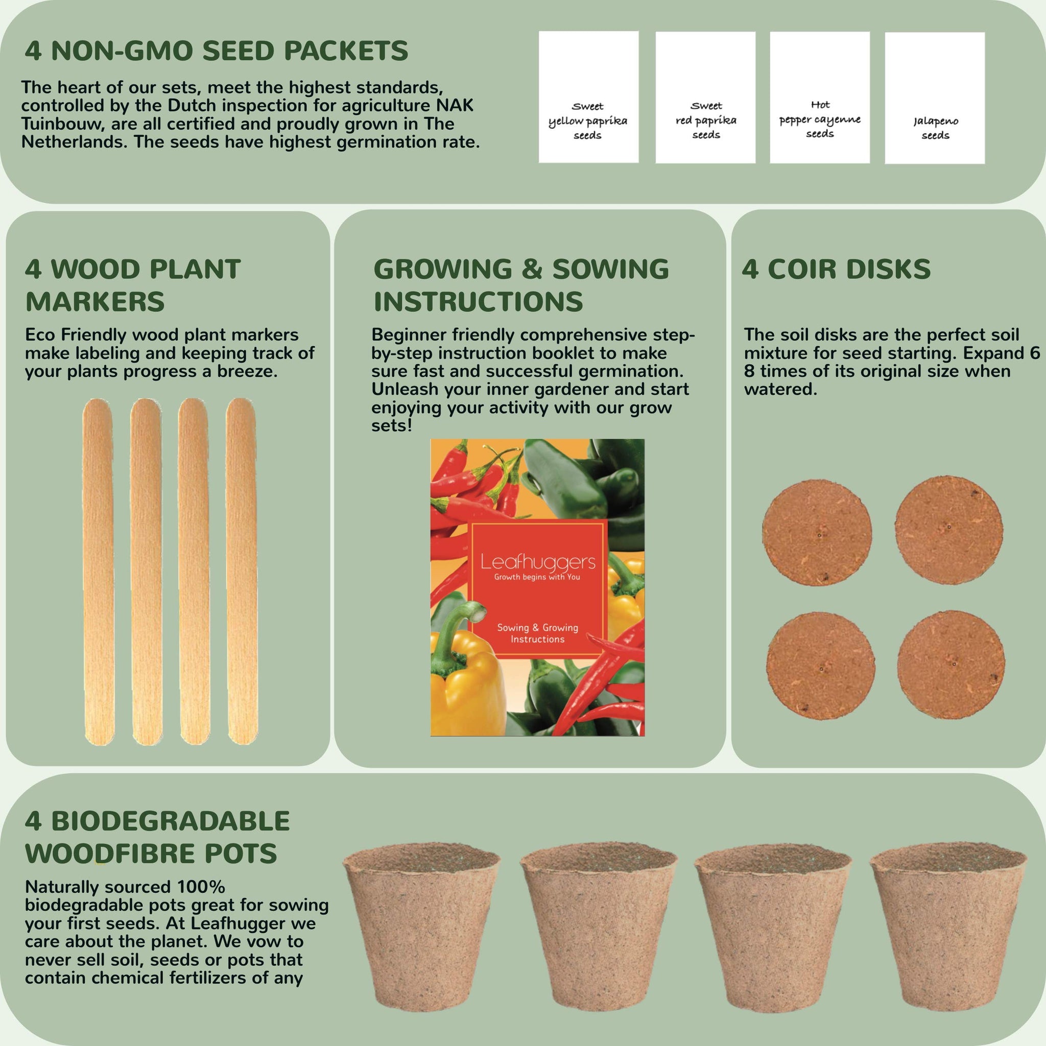 • 🌱 FALLI CRESCERE E MANGIALI A CASA Ecco la tua occasione per coltivare peperoni freschi e nutrienti e usarli in cucina. Questo kit di coltivazione comprende: 1. SEMI DI PEPERONE PICCANTE DI CAYENNA - una qualità di peperoncino, il re delle erbe medicinali, 2. SEMI DI PEPERONE ROSSO YOLO WONDER - fantastica fonte di vitamina C ed E, 3. SEMI DI PEPERONE GIALLO DOLCE CALIFORNIA WONDER - fonte dolce e fruttata di fibre alimentari e 4. SEMI DI PEPERONCINI JALAPEÑO - ricchi di vitamina A e C
