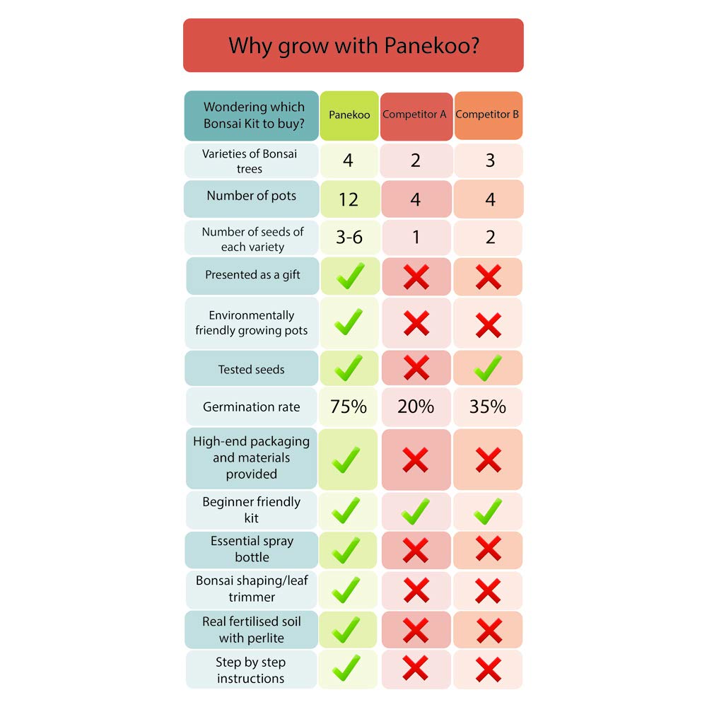 Coltivare il tuo bonsai non è mai stato così facile grazie al kit di Panekoo! Abbiamo incluso una selezione di specie per principianti, per aumentare la possibilità di successo e la velocità di crescita del tuo bellissimo bonsai.
