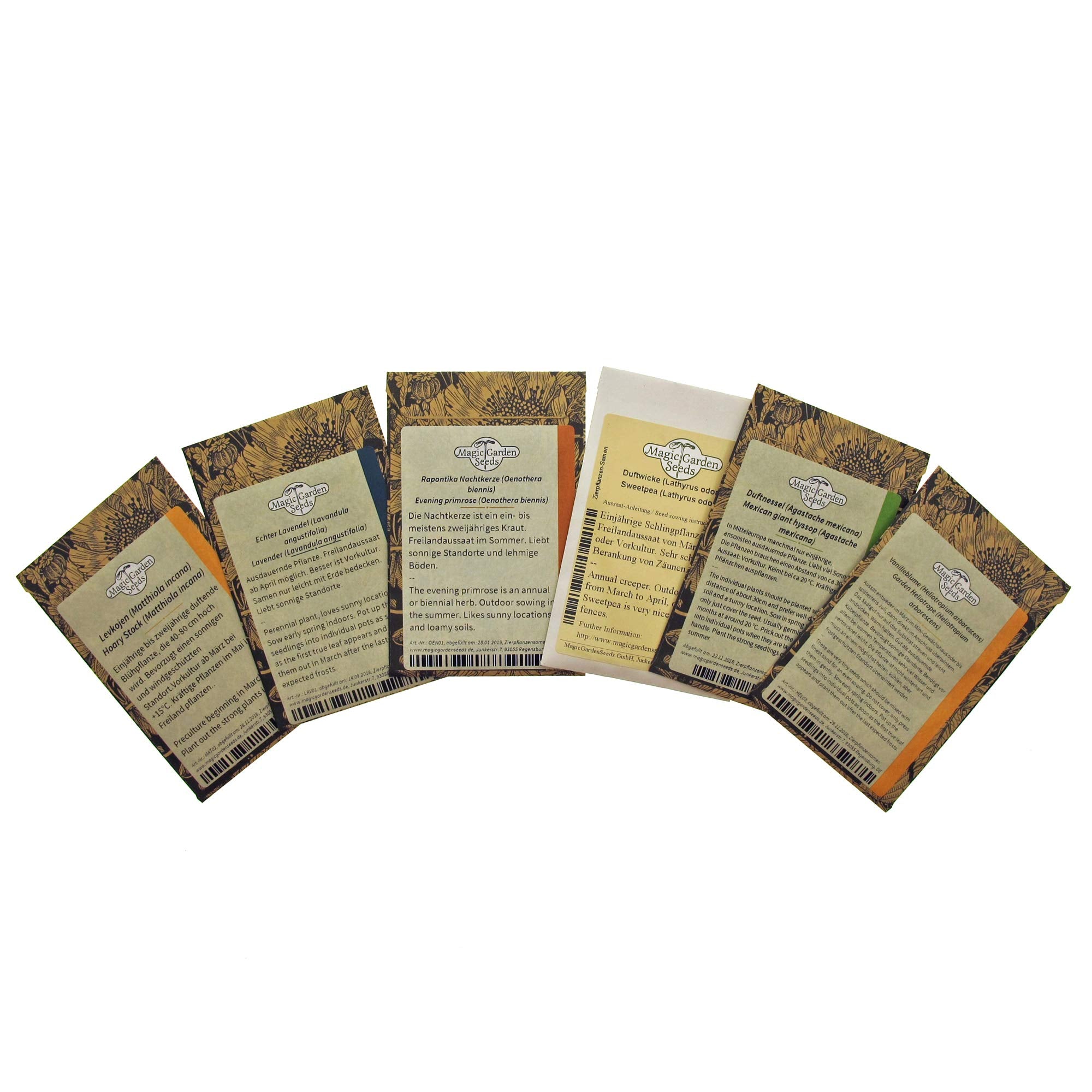 • Questo kit di semi contiene: Anice menta messicana, Lavanda officinale, Cicerchia odorosa, Fior di vaniglia, Enagra comune e Violaciocca rossa