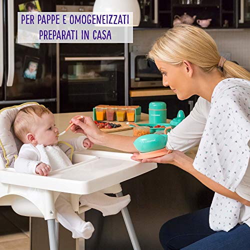 - MULTIUSO - Adatti a freezer e micronde per conservare o riscaldare purè di verdura e frutta, pappe, brodo a altri alimenti; set composto da 8 vasetti con coperchio e pratico vassoio turchese