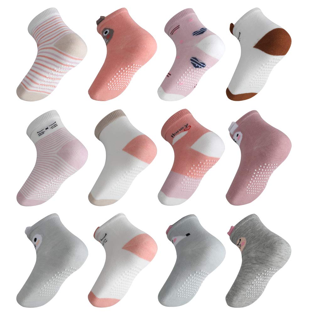 Lictin 12 Paia Calze antiscivolo per Ragazza - Calzini Presa Antiscivolo Cotone per Bambina 1-3 anni,Stampa Animalier,Colore Casuale