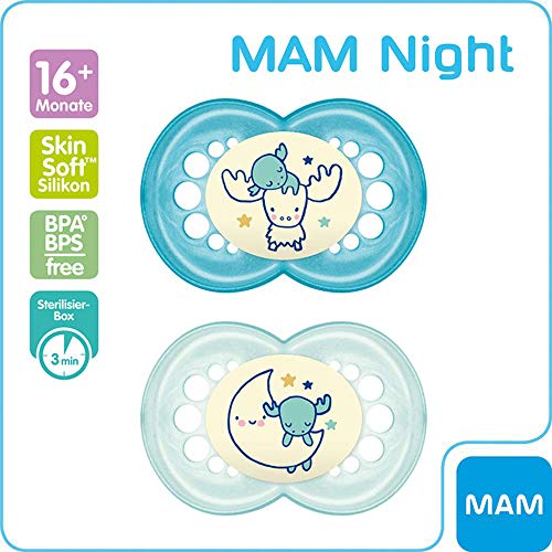 Set di 4 ciucci MAM "Skin Soft" in silicone: 2 ciucci MAM originali con motivi simpatici, 2 ciucci MAM Night – si illumina al buio con tettarella simmetrica in silicone speciale – particolarmente morbido in bocca del bambino con scatola per il trasporto sterilizzato