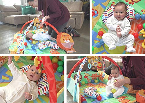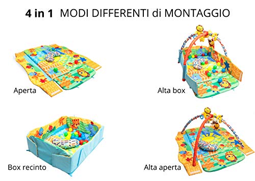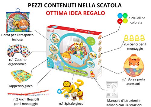 WARRALL M205H, Palestrina Multifunzione Evolutiva per Neonati e Bambini, 5-in-1 Giocattoli Sensoriali, 20 Palline, Cuscino Ergonomico, Tappetino Gioco Imbottito Morbido XL 120x100 cm Trasportabile