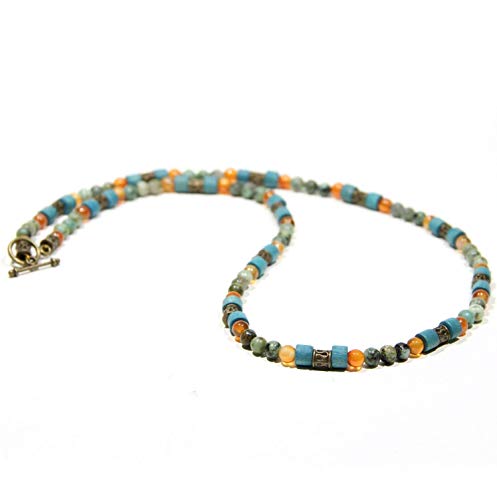 Collana multicolore in perle di corniola e turchese africano con perline di legno e perle di bronzo in stile tibetano, per uomo e donna. Dimensioni: 19 "(~ 48,5 cm) sulla foto (Modello: 185cm/73kg). Fatto a mano solo con nuovi materiali.