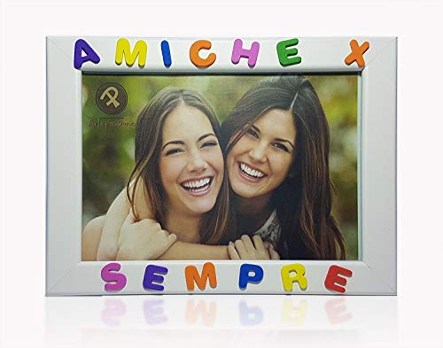 Cornici per foto in legno con la scritta Amiche x Sempre. Misura interna per la foto 13 x 18 cm e si può usare per fotografie di misura inferiore e le dimensioni esterne della cornice è di 21 X 16 cm. Cornice di colore Bianca. Le lettere sono tutti colorati e fatti in materiale di gomma crepla (foam) incollati sulla cornice in forma ondulata. Posizione in orizzontale. Si può appoggiare o appendere. Ideale per la fotografia con l'amica del cuore.
