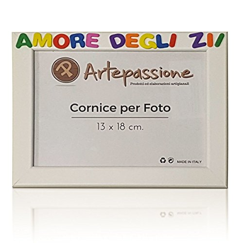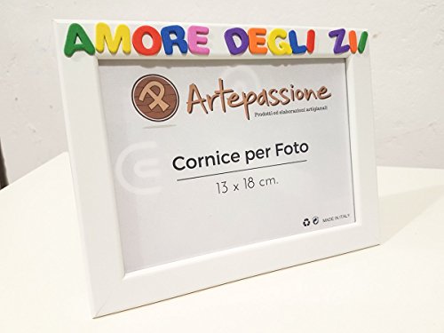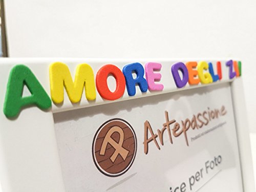 Cornici per foto in legno con la scritta Amore Degli Zii. Misura interna per la foto 13 x 18 cm e si può usare per fotografie di misura inferiore e le dimensioni esterne della cornice è di 21 X 16 cm. Cornice di colore Bianca. Le lettere sono tutti colorati e fatti in materiale di gomma crepla (foam) incollati sulla cornice in forma ondulata. Posizione in orizzontale. Si può appoggiare o appendere. Ideale come ricordo per trasmettere un bel messaggio.