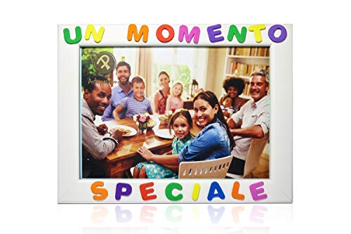 Cornici per foto in legno con la scritta Un Momento Speciale. Misura interna per la foto 13 x 18 cm e si può usare per fotografie di misura inferiore e le dimensioni esterne della cornice è di 21 X 16 cm. Cornice di colore Bianca. Le lettere sono tutti colorati e fatti in materiale di gomma crepla (foam) incollati sulla cornice in forma ondulata. Posizione in orizzontale. Si può appoggiare o appendere. Ideale come ricordo per trasmettere un bel messaggio.