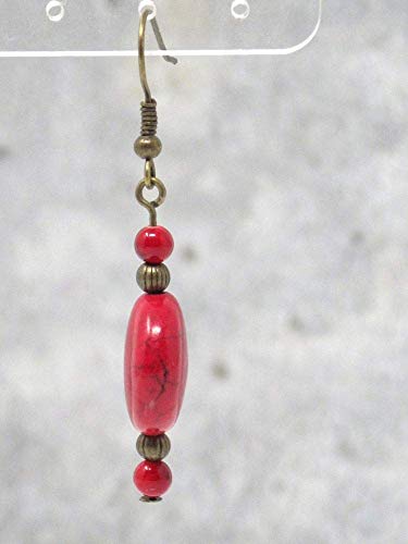 Bellissimi orecchini pendenti hippie chic realizzati artigianalmente in Francia con perle rosse in turchese ricostituito e con perle di bronzo tibetano. Il set è molto chic, li amerai. Il tutto è montato su ganci di bronzo french. Stile: boemo, boho, zingaro, tribale, etnico, zen Amo: bronzo french Altezza: 50 mm Perle: turchese ricostituito (16x6 mm e 4 mm), perle di bronzo tibetano Materiali: turchese ricostituito, bronzo, ottone Colore: rosso Colore del metallo: bronzo