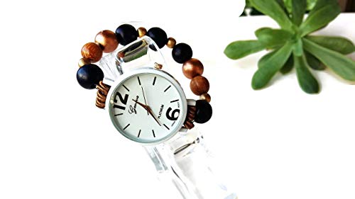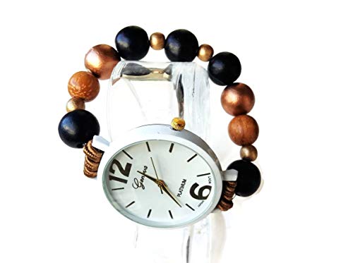 Orologio da polso donna elasticizzato Bracciale perle Legno Bianco Nero Bronzo Regalo per Amica