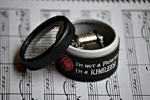 E la frase "Io non sono una principessa, sono Khaleesi". Il Trono di Spade. Un regalo per i fan della famosa serie. Misure: Diametro: 5,5 cm, Altezza 4,5 cm Il carillon dispone di una manovella da attivare manualmente: bisogna girarla con la mano affinchè suoni la musica. Puoi visitare il mio canale di Youtube per vedere come sono fatti e come funzionano: confezionato per regalo