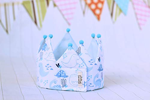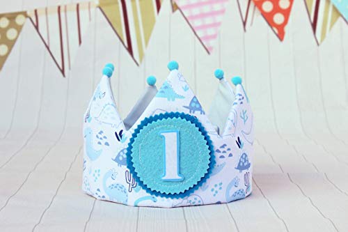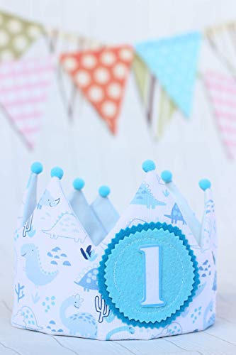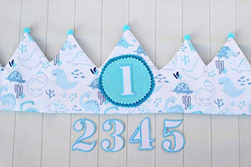 Corona di compleanno ideale per il primo regalo di compleanno del bambino. E' una corona in tessuto di cotone con disegni di dinosauro in bianco e blu con applicazioni di feltro. E 'fatto a mano con grande cura e affetto. E 'perfetto per un regalo di compleanno, decorazione di compleanni per bambini. I numeri sono adesivi e modificabili, viene fornito con numeri da 1 a 5.