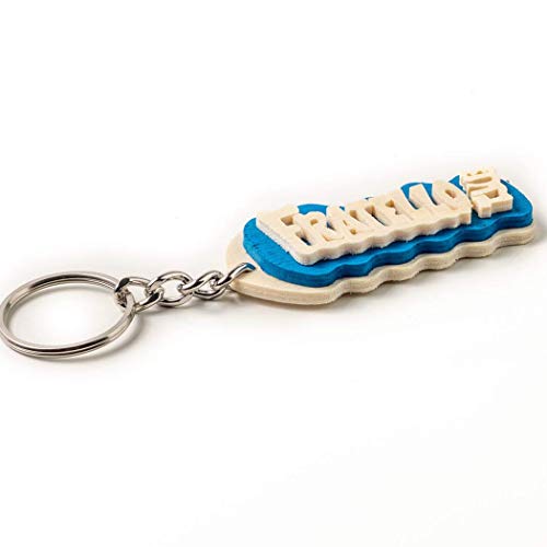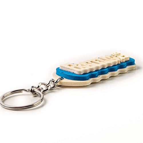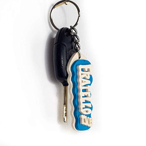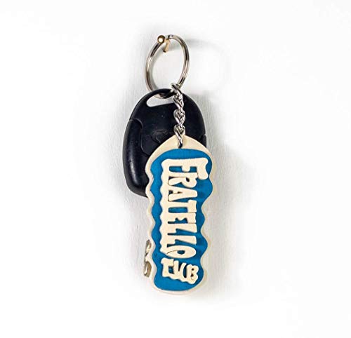 Portachiavi di legno intagliato a mano libera con il traforo con la scritta Fratello TVB, ideale per il grande o piccolo fratello, che si vuole tanto bene, fatto su tre strati di legno colorati e incollati uno sull'altro, sono resistenti e leggeri e non sono ingombranti e hanno una forma che non dà fastidio in tasca. Portachiavi di colore celeste.