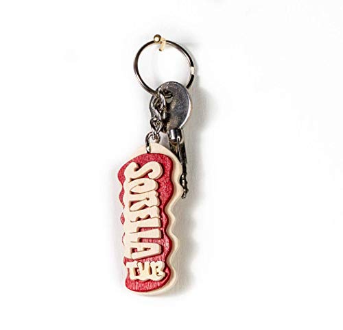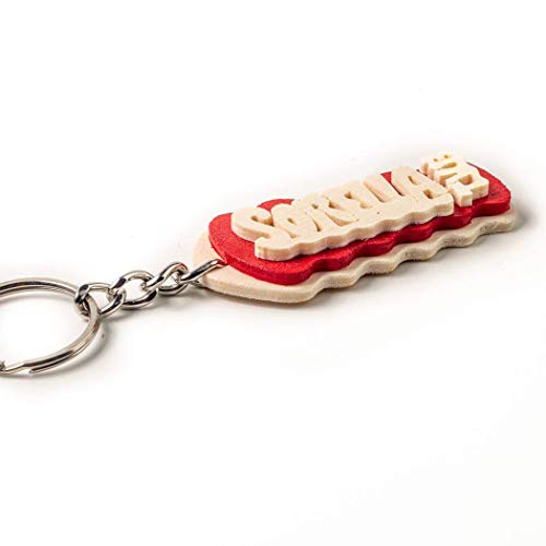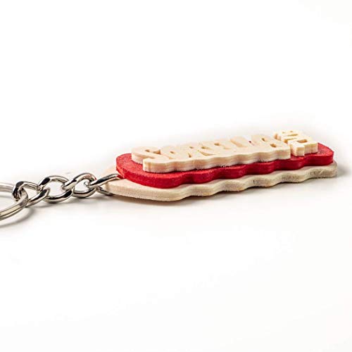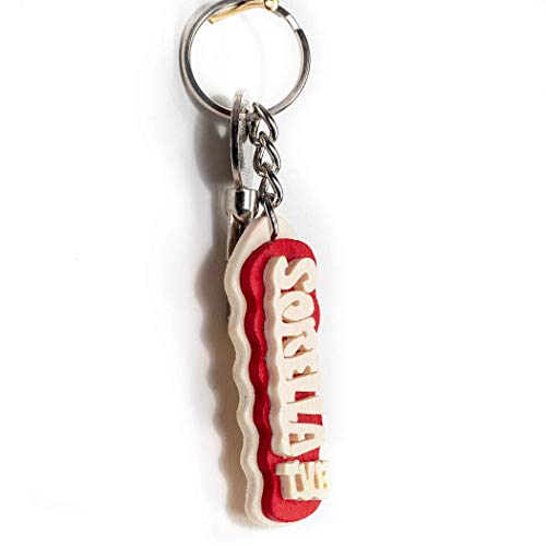 Portachiavi di legno intagliato a mano libera con il traforo con la scritta Sorella TVB, ideale per la grande e piccola sorella che si vuole tanto bene, fatto su tre strati di legno colorati e incollati uno sull'altro, sono resistenti e leggeri e non sono ingombranti e hanno una forma che non dà fastidio in tasca, portachiavi di colore rosso.
