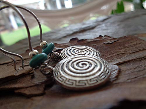 Questi orecchini sono fatti di un meraviglioso, spesso disco a spirale realizzato in argento tibetano, che è stato collegato direttamente a un gancio per l'orecchio extra large con perla in metallo e un rondel in pietra naturale blu turchese. Meraviglioso nello stile etnico boho alla moda ... Gli orecchini sono consegnati in una busta di organza e sono quindi adatti anche come oggetto da regalo. Lunghezza:. Larghezza massima 4,3 cm: 1,7 cm, solo disco: 2,1 cm Con occhiello pendente