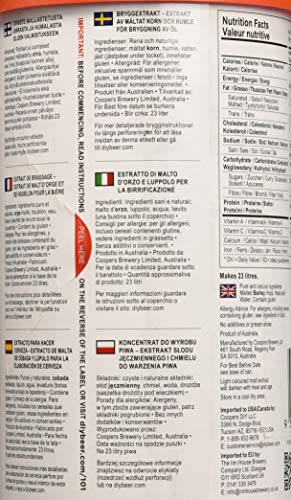 • Questo kit contiene istruzioni complete, 1 x Scatola di estratto di malto, 1 x bustina di lievito per la fermentazione e rende circa 40 pinte (23 litri).