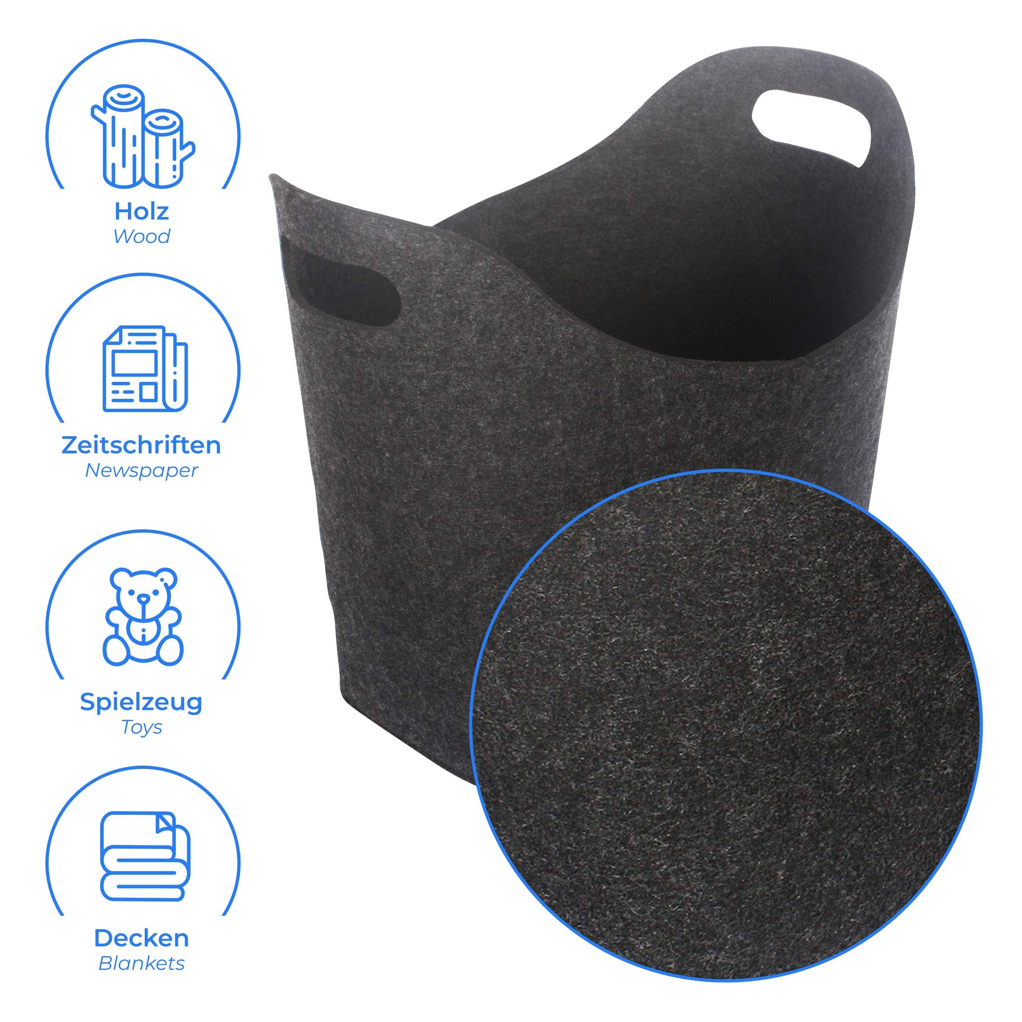 - Massimo comfort - Le cinghie di trasporto in morbido feltro piegato assicurano la massima comodità, anche a pieno carico. Grazie alla sua capacità di carico, il cestino è il perfetto aiuto quotidiano per legna da ardere o grandi acquisti, come portagiornali e borsa portaoggetti, nonché come cesto per la biancheria o cestino per la carta.