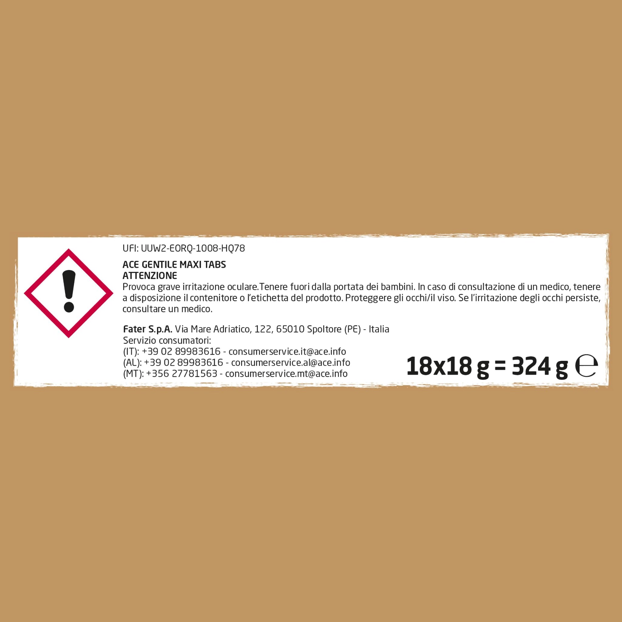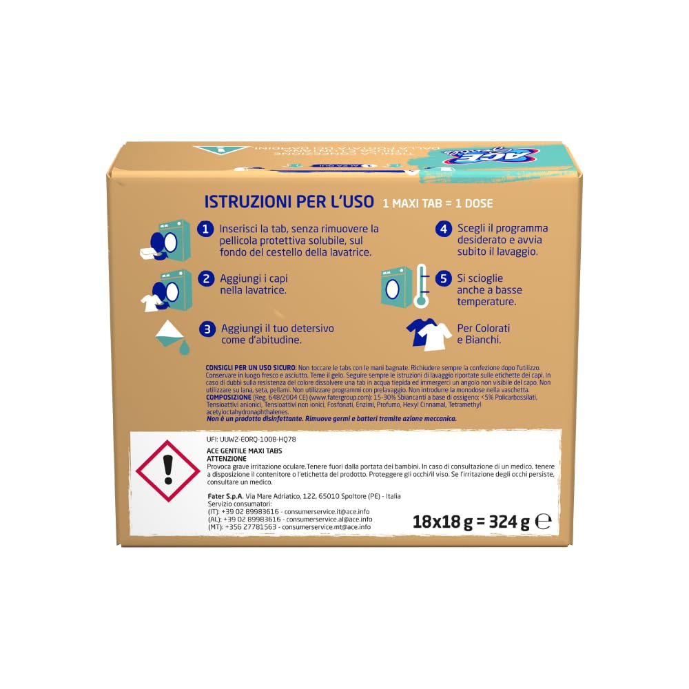 ACE Gentile Maxi Tabs – 18 Pastiglie monodose di candeggina delicata multiuso per superfici e lavatrice. Smacchia e igienizza, adatta a capi colorati, zero sprechi zero schizzi, con ossigeno attivo.