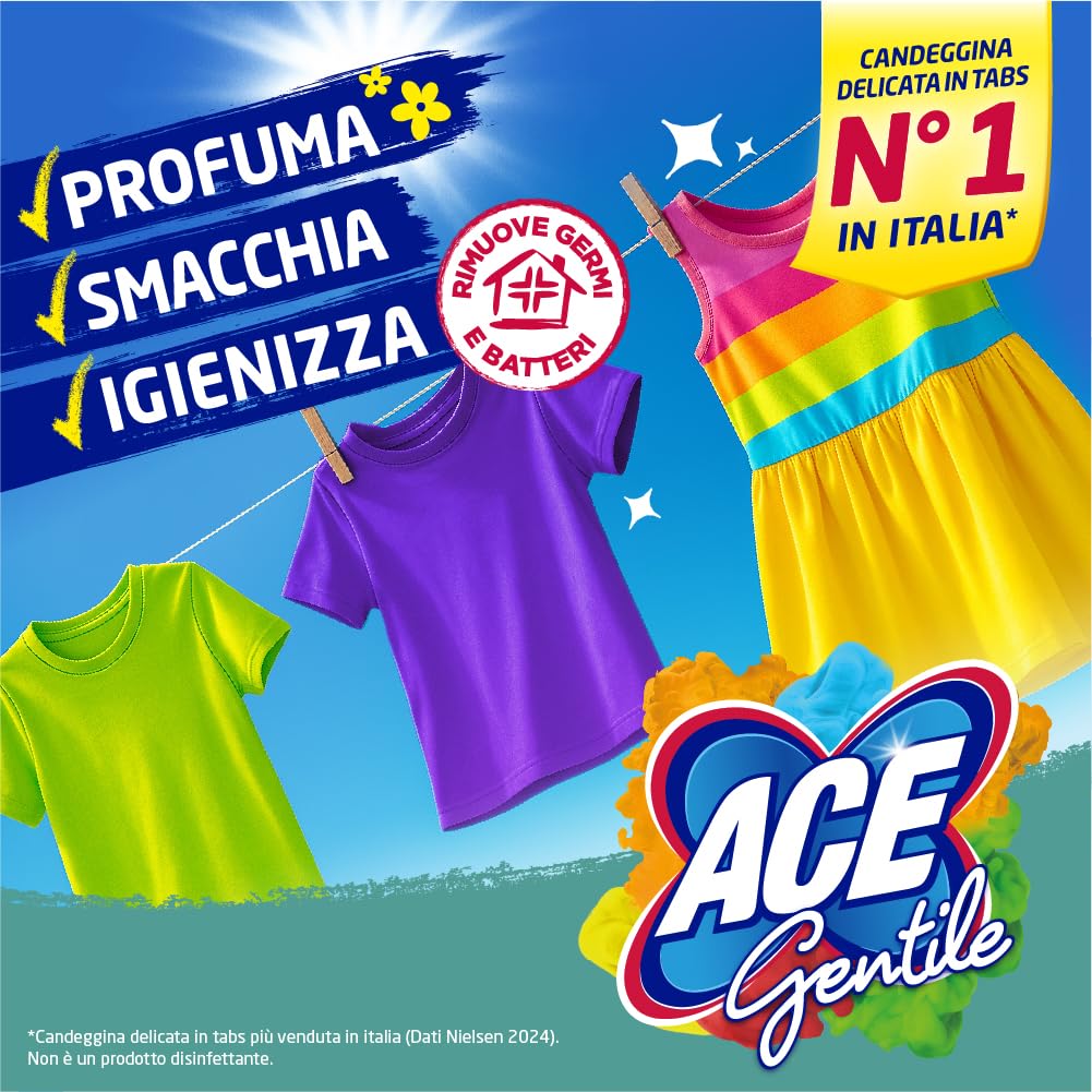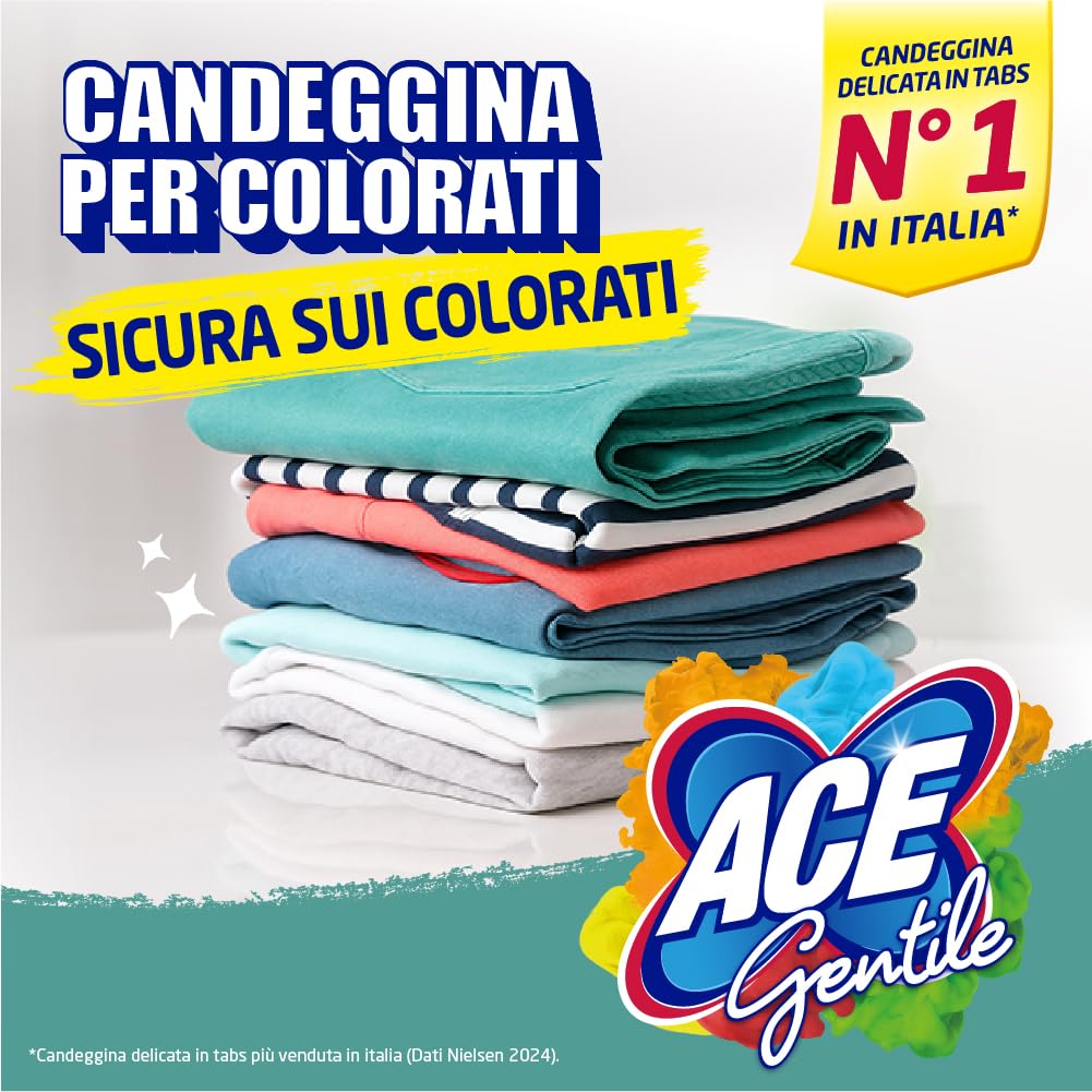 ACE Gentile Maxi Tabs sono pastiglie di candeggina delicata studiate appositamente per colorati in versione monodose: zero schizzi, zero sprechi e minimo ingombro. Sono sicure su tutti i colori e efficaci nella rimozione delle macchie enzimatiche, come la maionese e cioccolato, e ossidabili, come vino e caffè. A base di ossigeno attivo, inoltre, agiscono contro i cattivi odori e, unita all’azione meccanica del lavaggio, igienizzano il bucato rimuovendo germi e batteri.