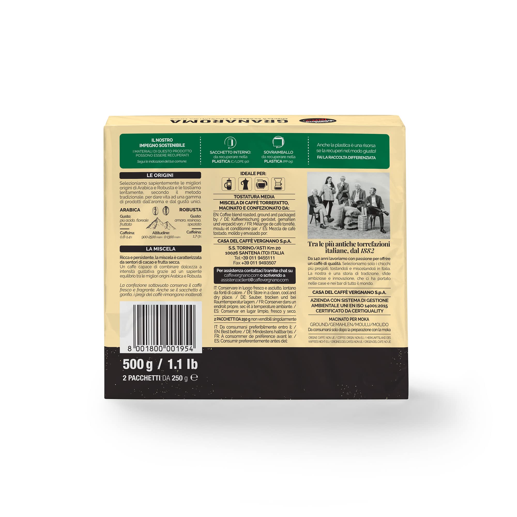 Ogni confezione contiene 2 confezioni da 250g di caffè macinato moka