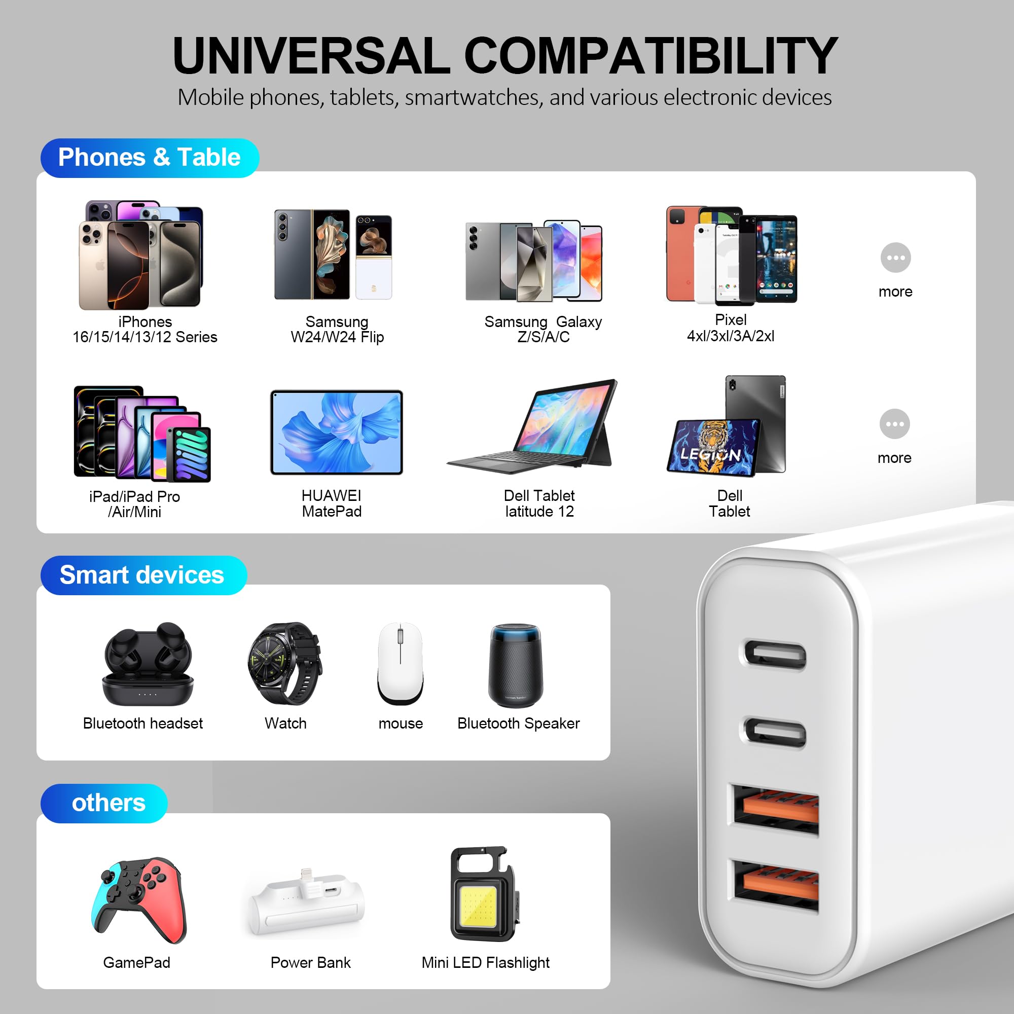 - [Caricabatterie a 4 Porte] La Presa Rapido USB C dispone di 2 interfacce USB-A e 2 Type C, compatibili con quasi tutti i caricabatterie USB. La porta USB-C offre velocità di ricarica fino a 45W/40W, mentre la porta USB-A offre una potenza di uscita di 18W. Il design di 4 porte consente di caricare stabilmente 4 dispositivi contemporaneamente e identificare automaticamente diversi dispositivi per una ricarica ottimale, risparmiando davvero tempo!