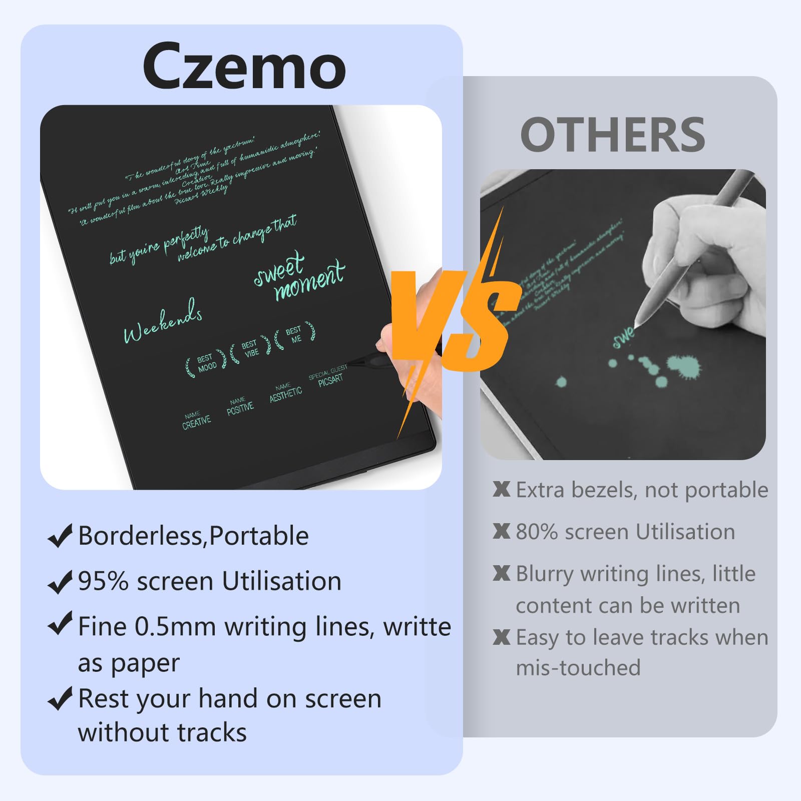 - ♻ SOTTILE E PORTATILE: sottile, leggero, perfetto per prendere appunti veloci e senza sforzo. Il profilo sottile della tavoletta grafica LCD da 9,5" la rende facile da riporre nello zaino o da portare con sé. Dì addio ai quaderni ingombranti e dai il benvenuto alla creatività ottimizzata con la lavagna LCD da 9,5 pollici di Czemo. Dimensioni: 20 x 13,5 cm