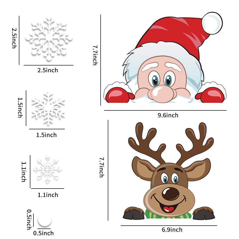 - 【Dimensioni】Babbo Natale circa 27 x 20 cm/10,5 x 7,8 pollici, Rudolph circa 19 x 20 cm/7,48 x 7,8 pollici, 4 fogli di adesivi natalizi a forma di fiocco di neve di diverse dimensioni e forma 22 x 28 cm /8,6 x11 di ciascuno, Possono formare una bellissima scena natalizia.