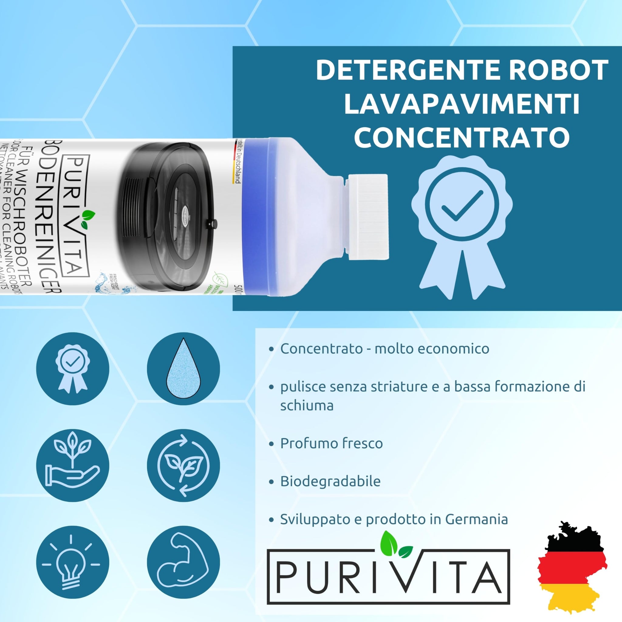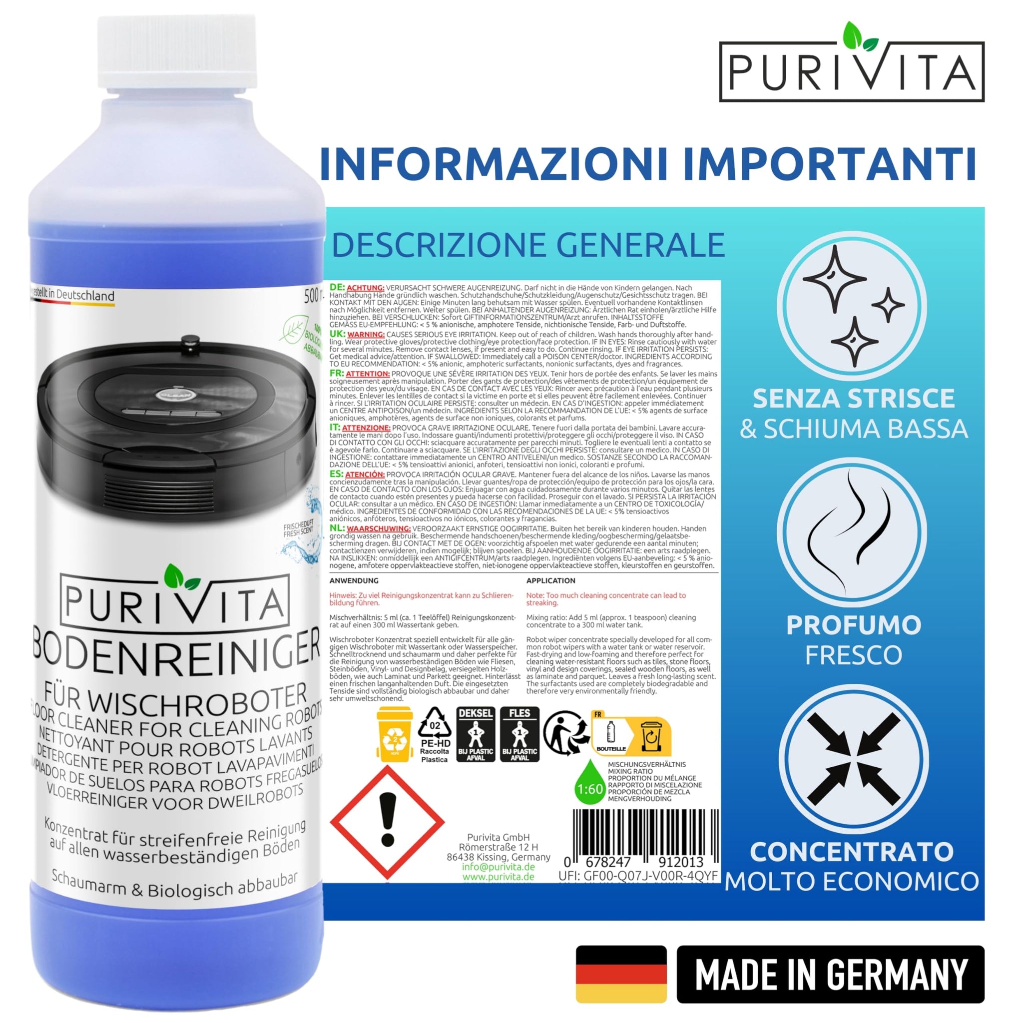 PULIZIA PROFONDA: il detergente concentrato per robot lavapavimenti e aspirapolvere pulisce in modo efficace, delicato e duraturo, oltre a fornire un gradevole profumo. Inoltre, pulisce senza lasciare aloni, asciuga rapidamente e crea poca schiuma. CONCENTRATO: il concentrato Γ¨ stato ideato e testato per robot lavapavimenti e aspirapolvere. Pertanto, non Γ¨ necessario risciacquare il detergente. In piΓΉ, Γ¨ biodegradabile. VANTAGGI: grazie al detergente, pulire a fondo pavimenti non rivestiti Γ¨ un gioco da ragazzi. Inoltre, asciuga molto rapidamente e riduce notevolmente lo sporco. Ideato per tutti i comuni robot con riserva o serbatoio d'acqua. AREE DI UTILIZZO: Il detergente si adatta bene alle seguenti aree: ingressi, cucina, bagno, scale, ufficio, corridoi, industria, casa, commercio, sale di ricevimento, studio, ufficio, studio di yoga, palestra e molto altro ancora! MULTIUSO: il detergente Γ¨ adatto a tutte le superfici impermeabili. PuΓ² essere utilizzato nei robot di pulizia disponibili in commercio ed Γ¨ adatto anche come componente aggiuntivo ai mop manuali.