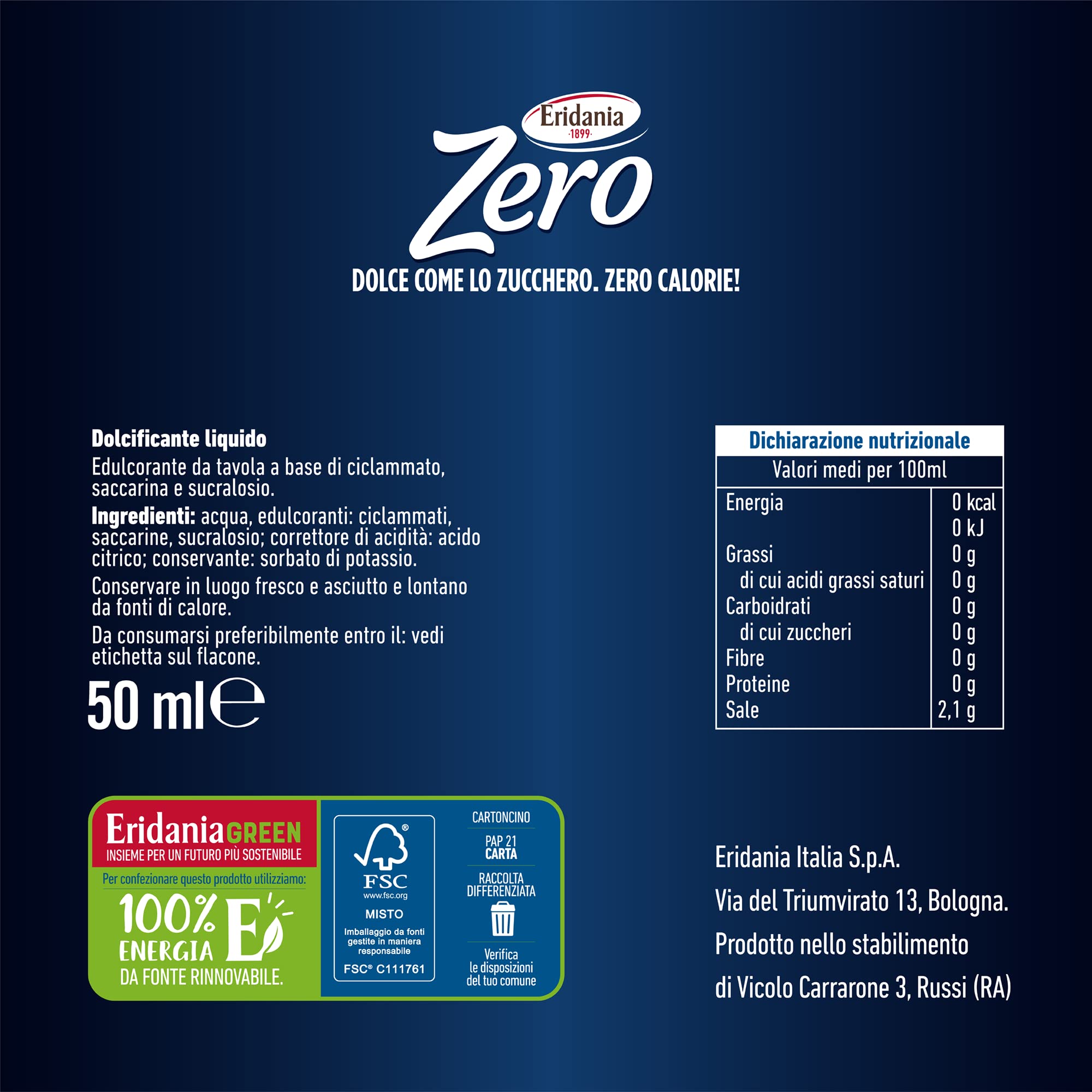 - 🌾 DOLCIFICANTE LIQUIDO 50 ML - E' il formato piu pratico della linea Eridaniza Zero. Packaging totalmente riciclabile, confezione esterna di cartoncino da carta FSC, flacone in plastica. Ingredienti: Acqua, Edulcoranti (ciclammati, saccarine, sucralosio), Correttore di acidità (acido citrico), Conservante (sorbato di potassio).