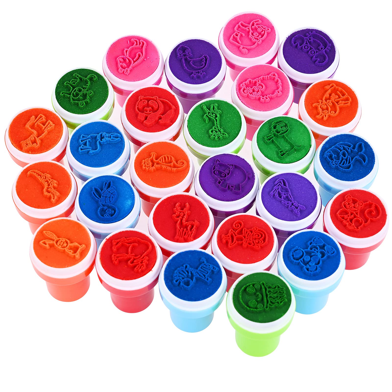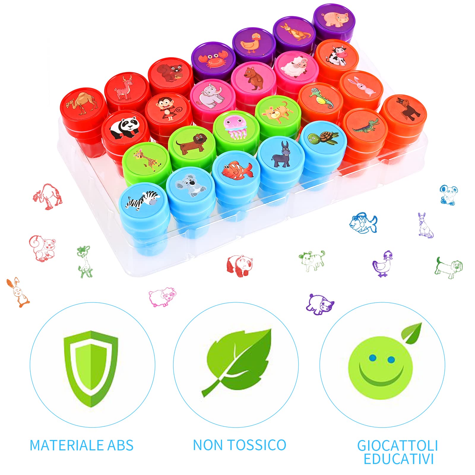 - Facili da usare e divertenti per tutti, i timbri sono dotati di inchiostro colorato integrato, quindi tutto ciò che devi fare è premere verso il basso. Niente più dita o segni disordinati sui tavoli.