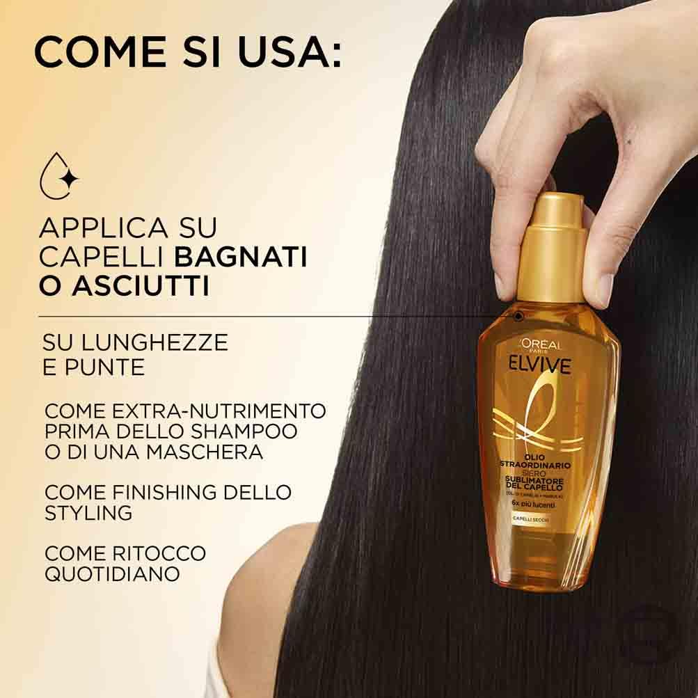 Olio sublimatore senza risciacquo dalla magica e preziosa texture, Gesto di bellezza per proteggere i capelli dalle aggressioni quotidiane, Per tutti i tipi di capello - Capelli visibilmente vitali e lucenti e non appesantiti grazie alla formula leggera e non grassa, Fibra elastica e setosa, Una sensazione di leggerezza e fluidità, Effetto anti-crespo a lunga durata - Modi d'uso: l’olio può essere applicato come trattamento nutriente prima dello shampoo, Prima della piega per come prodotto per lo styling, Sui capelli asciutti per sublimarli e renderli lucenti - Formula arricchita con 6 estratti oleosi preziosi, Con Oli di camelia e marula che combattono l'effetto crespo senza appesantire e nutrono intensamente, Pratico dosatore per un'applicazione ottimale - Contenuto: 1x L'Oréal Elvive Trattamento, Per Capelli Normali o Secchi, Protegge da Aggressioni e Nutre la Fibra, Con Oli Preziosi di Marula e Camelia, Olio Straordinario, 100 ml
